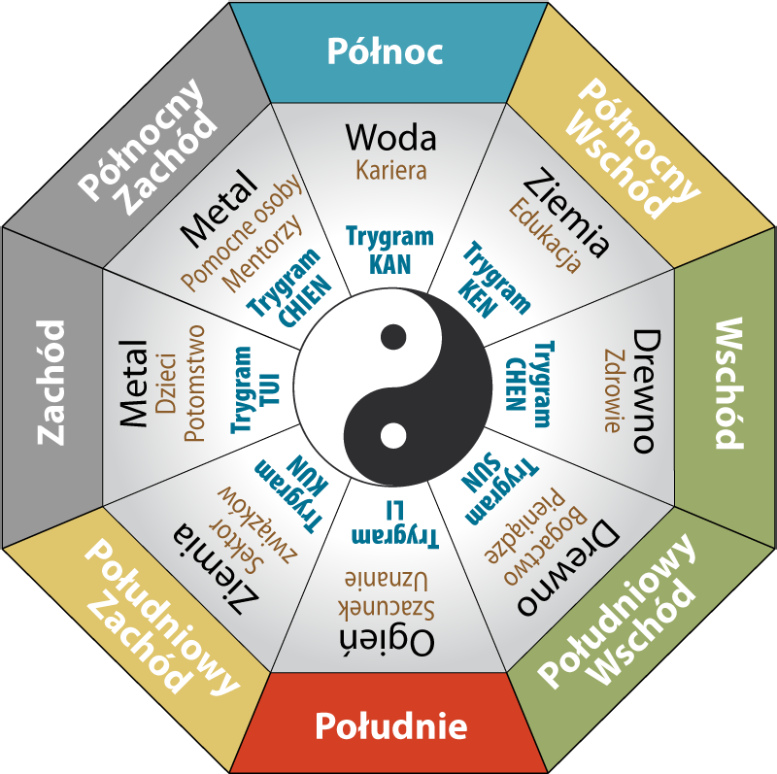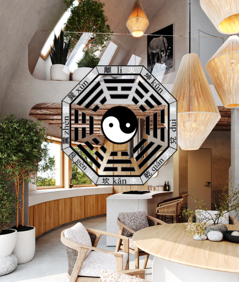 Les principes du Feng Shui pour la maison intègrent le concept des Huit Trigrammes (ou grille Bagua), selon lequel les forces de la nature se réduisent à huit trigrammes fondamentaux. Ces derniers sont représentés graphiquement sur le Bagua : un octogone divisé en huit parties égales, chacune correspondant à un trigramme. Selon les principes du Feng Shui, ces parties sont interprétées comme des domaines de la vie : carrière et chemin de vie, connaissance et sagesse, famille, ancêtres, richesse, prospérité, renommée et réputation, relations, amour, création, enfants et personnes bienveillantes.